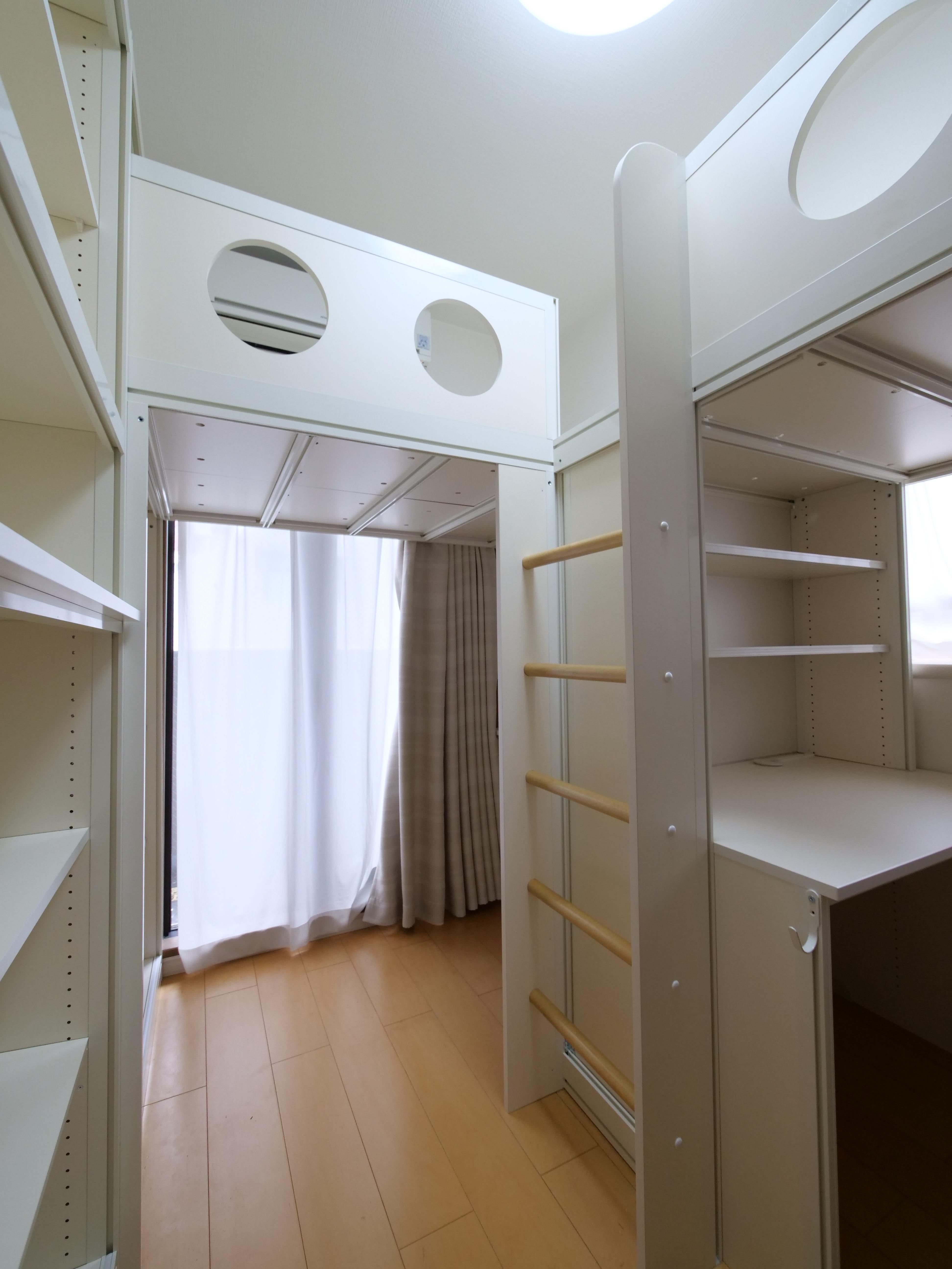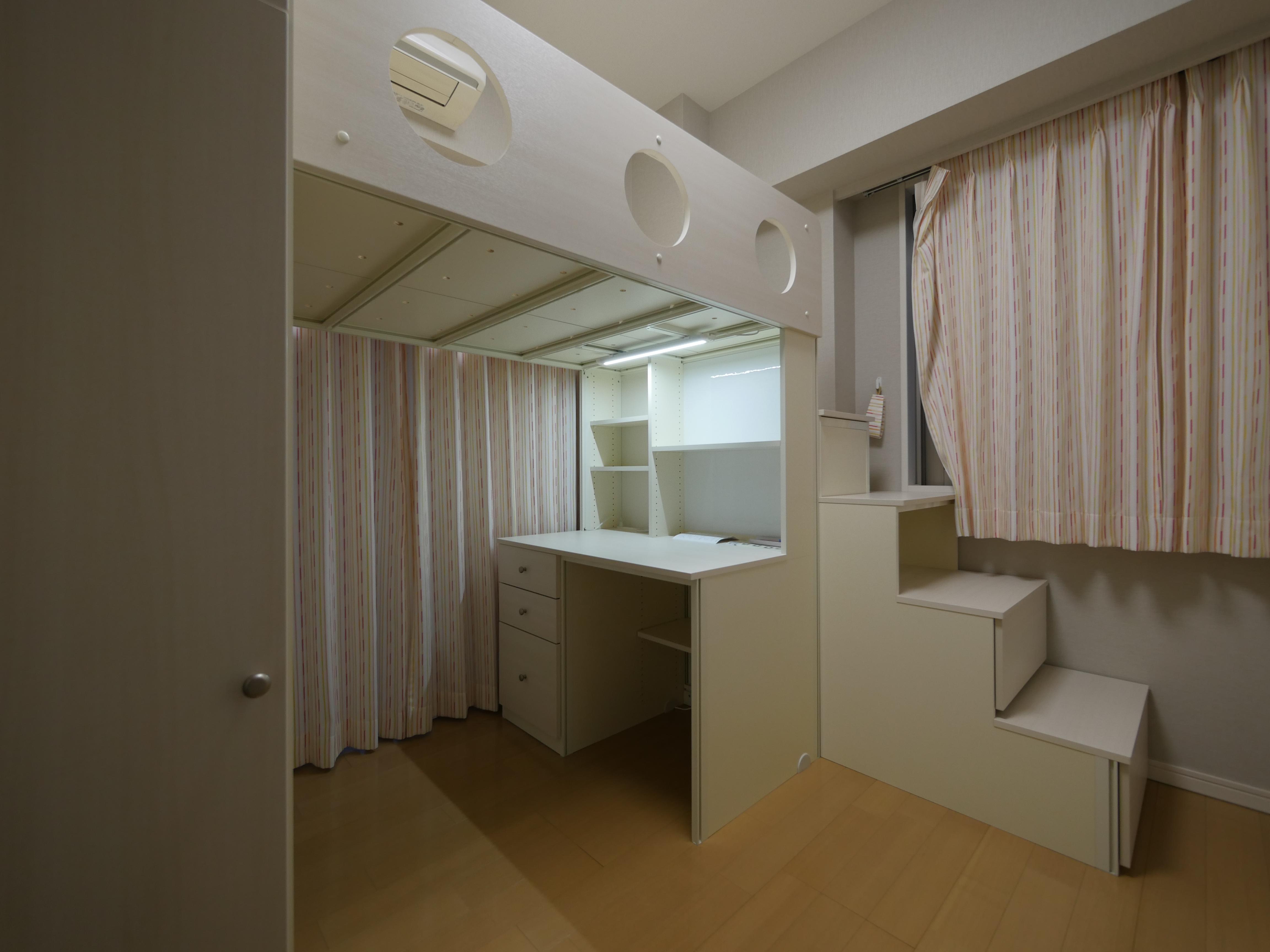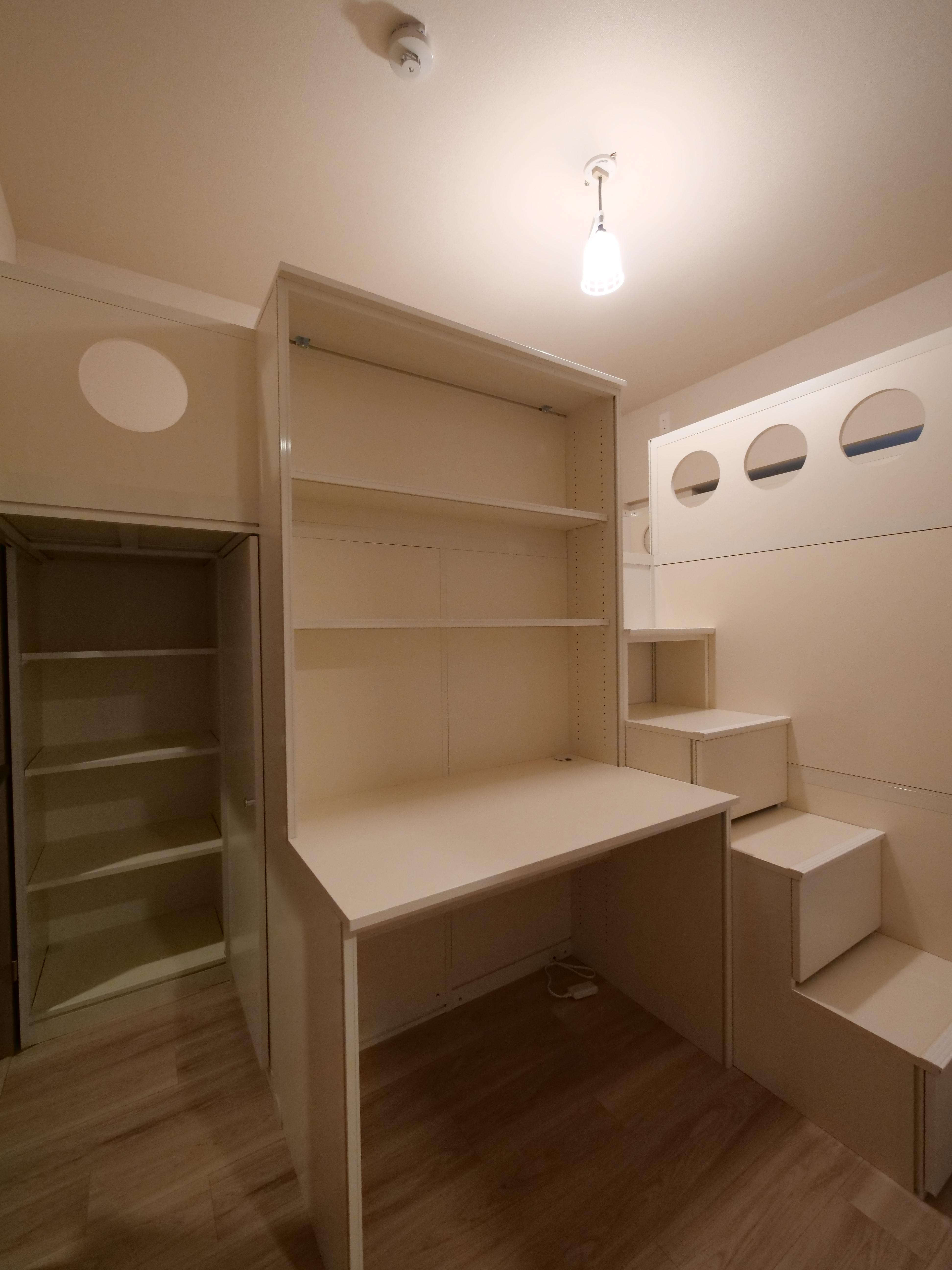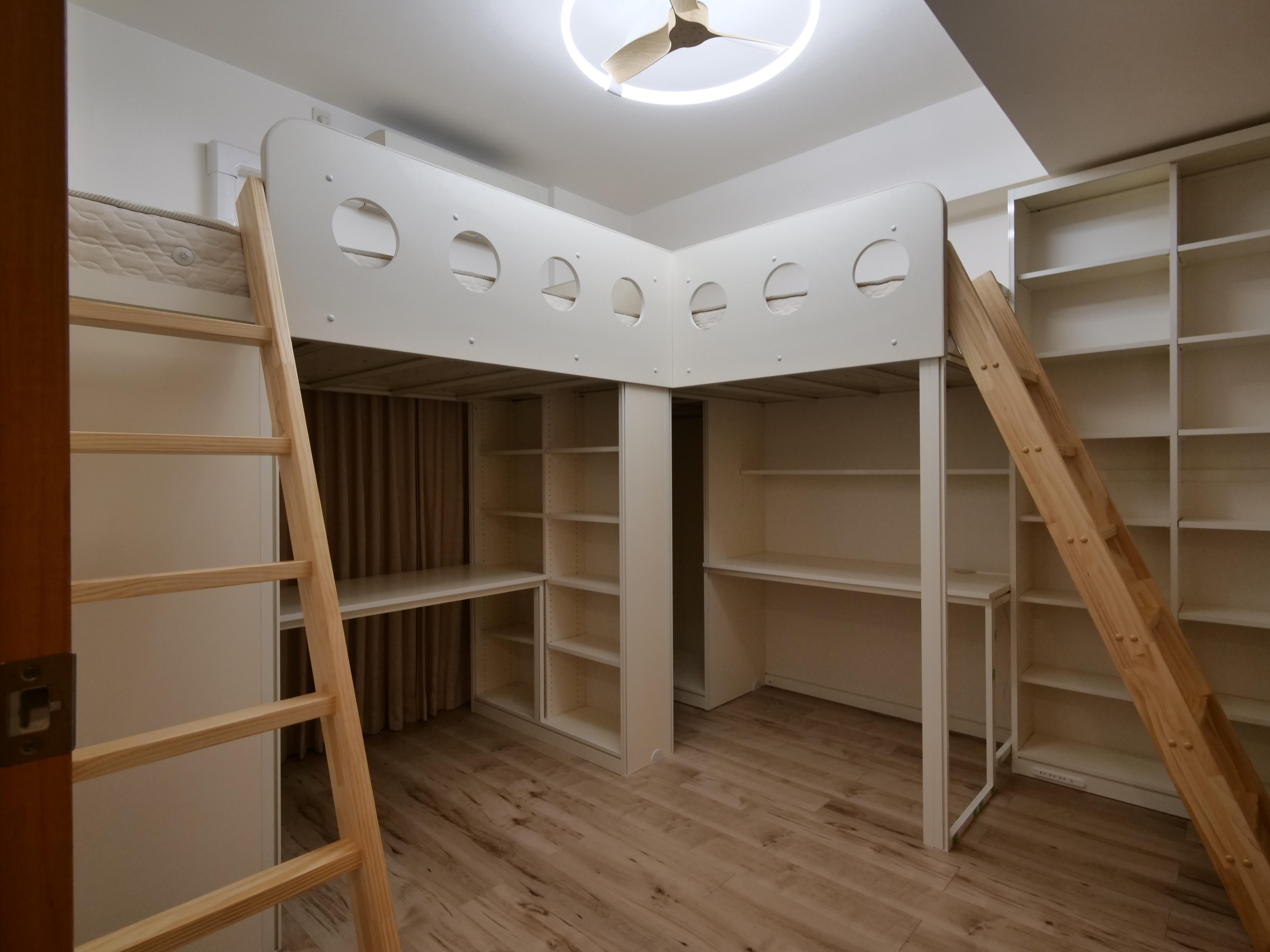 リピーター様より、既製品や従来品のオーダー家具では絶対に実現できない空間利用をリクエストいただきましたので、お気に入りの可愛いタンスも活用しながら、姉妹で机の広さや収納量に差が出ないよう工夫しています。