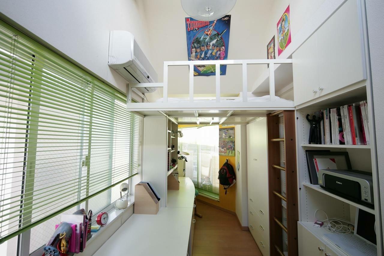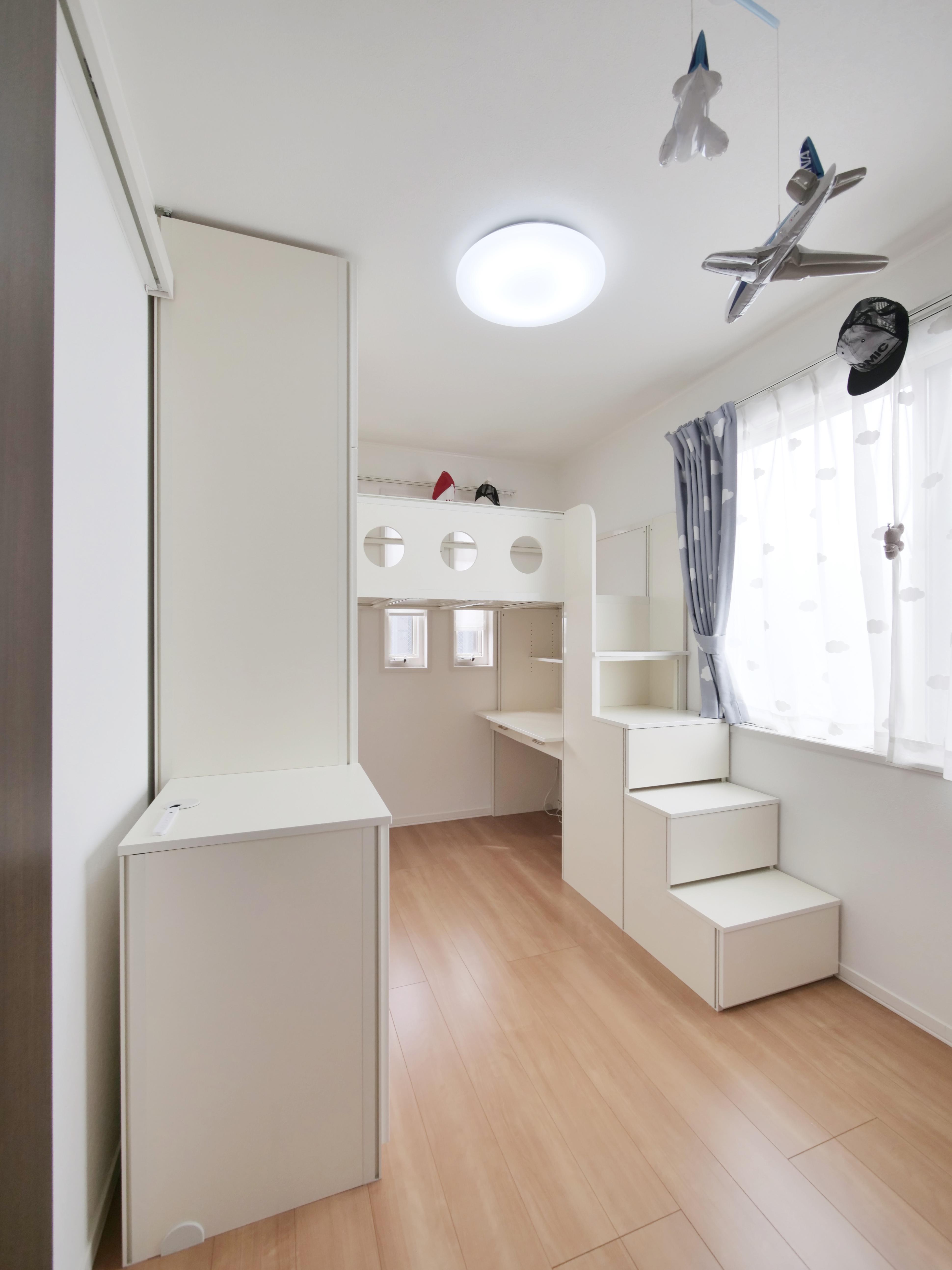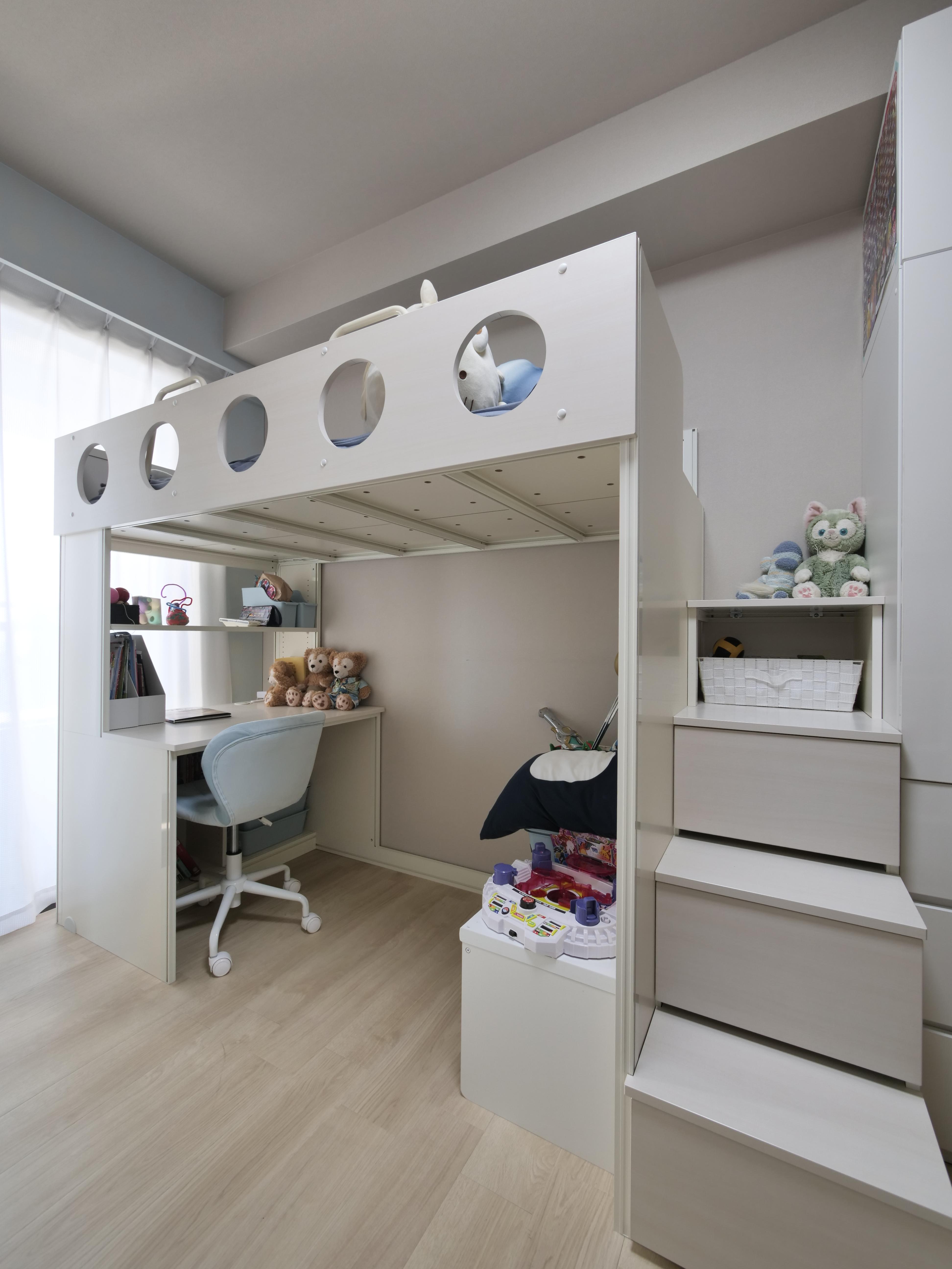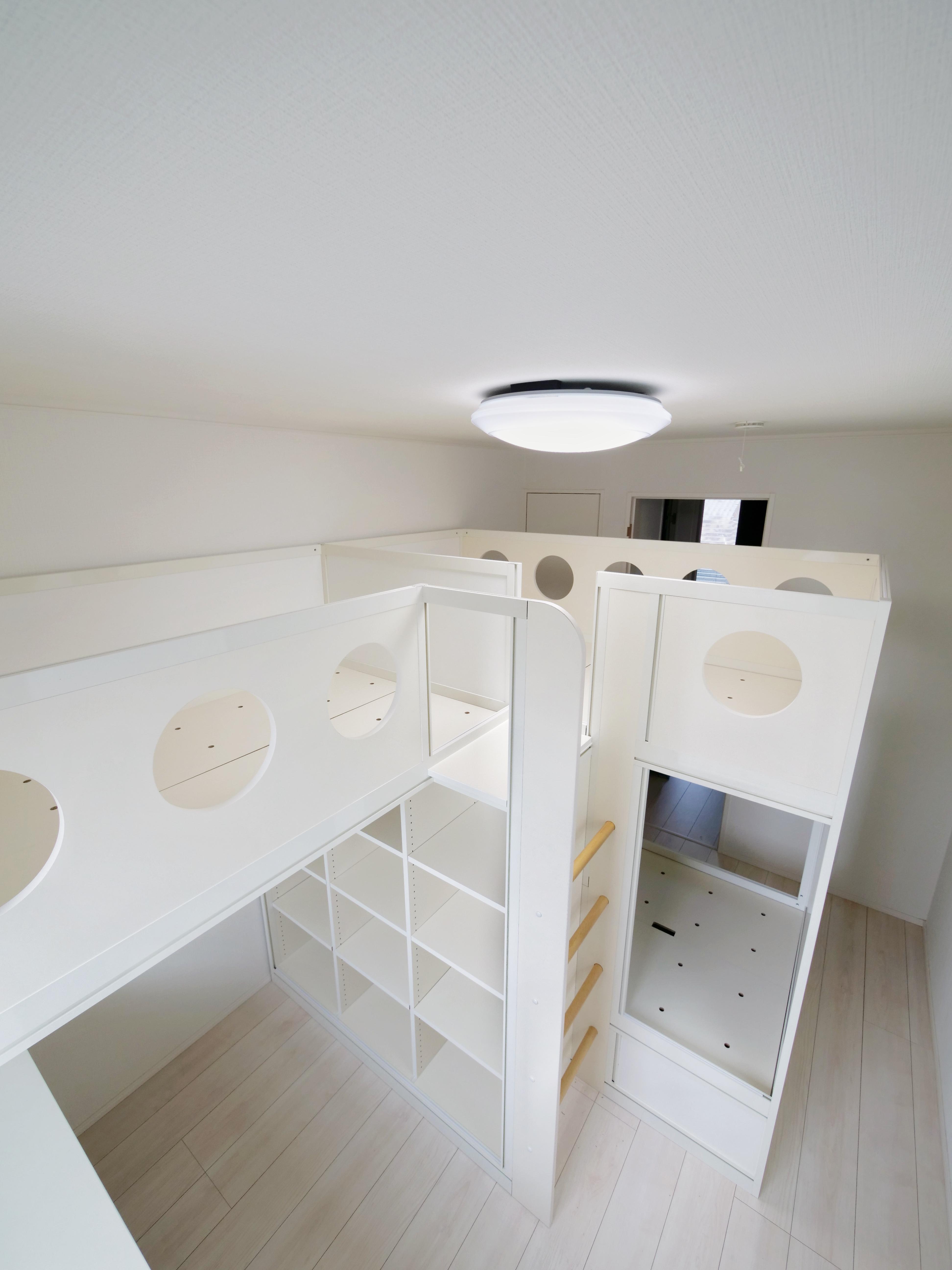 リピーター様より、既製品や従来品のオーダー家具では絶対に実現できない空間利用をリクエストいただきましたので、お気に入りの可愛いタンスも活用しながら、姉妹で机の広さや収納量に差が出ないよう工夫しています。