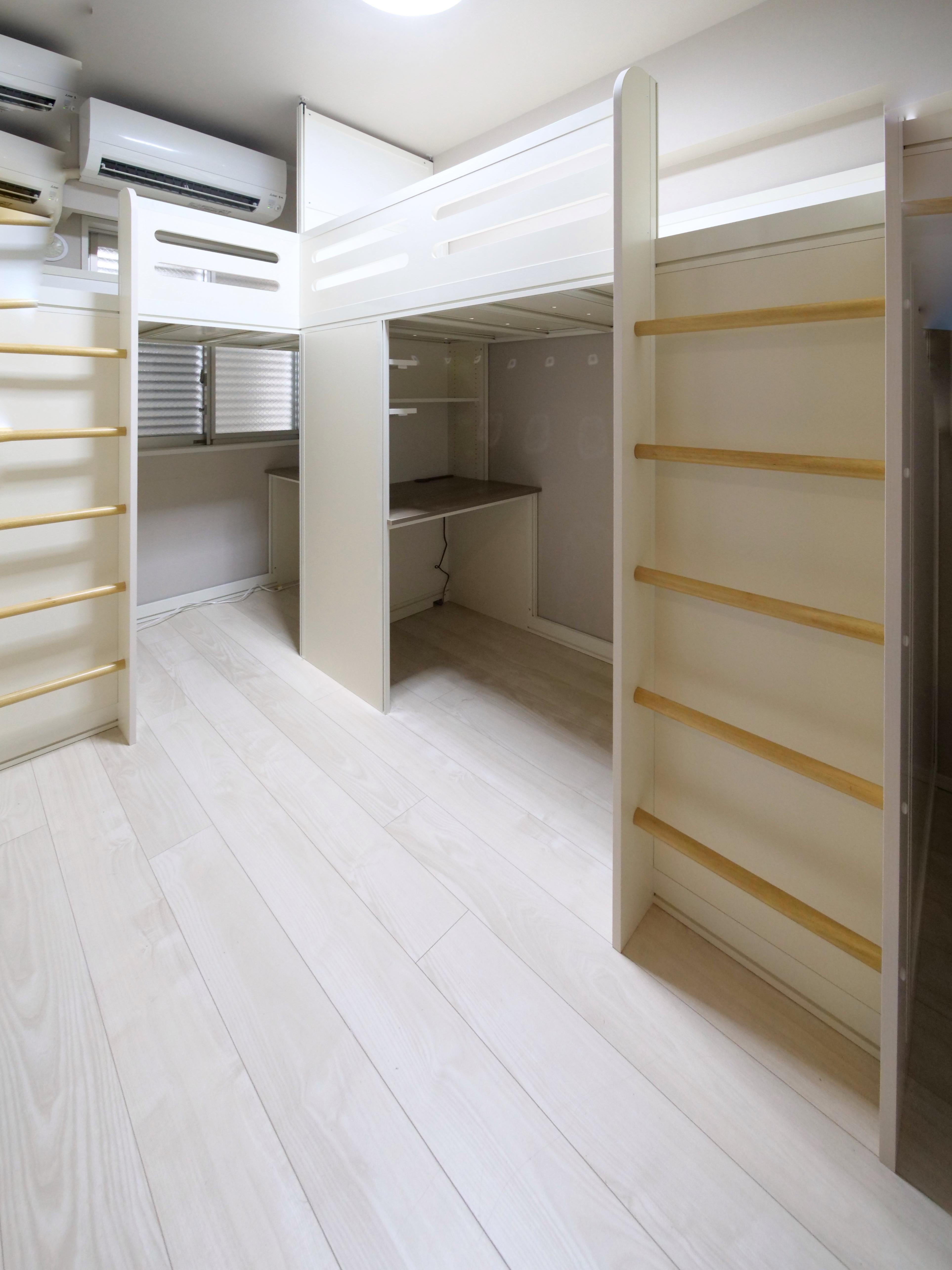マンションの5畳のお部屋に娘さんお二人分のベッド、デスク、衣類その他の収納棚を、デッドスペース無く製作しました。