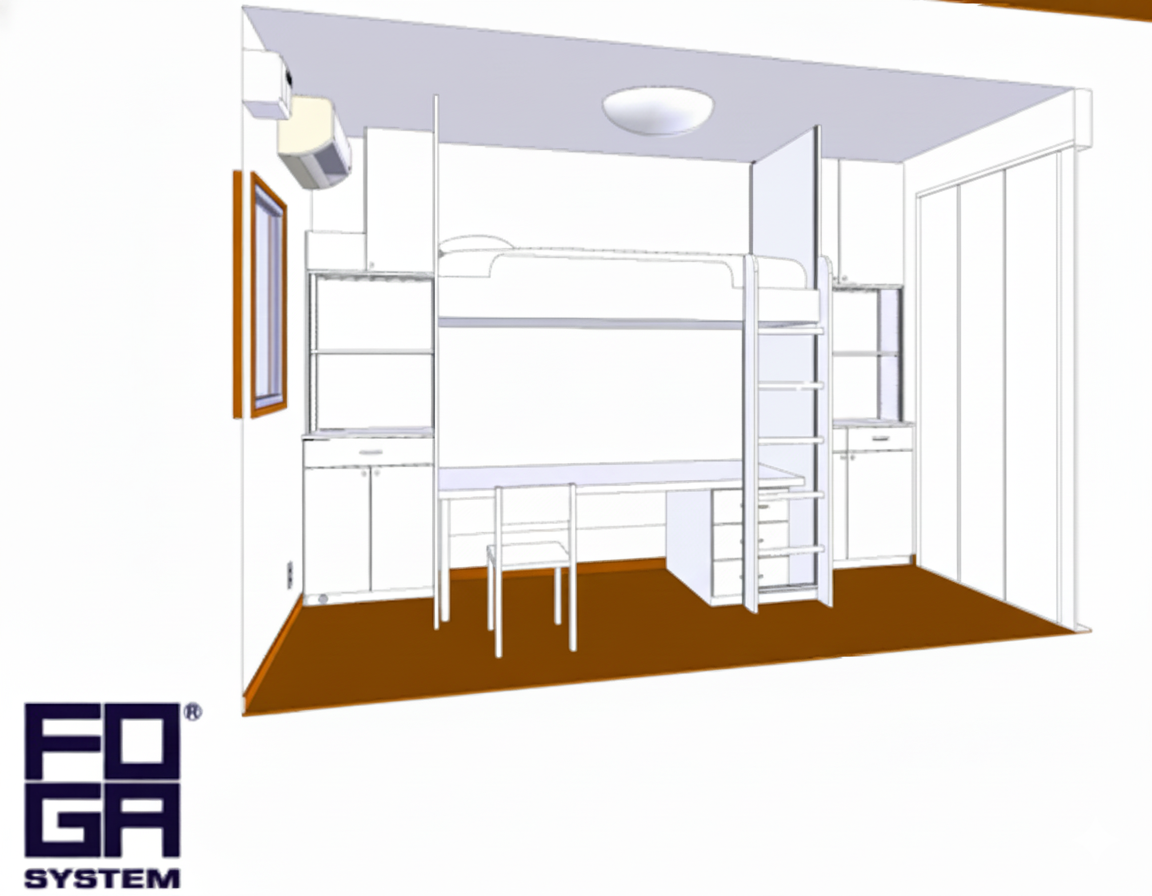 これだけ強度の高い家具も、設置時に壁に釘打ちネジ留めして固定したのでは大地震の際には、結局釘やネジの強度不足で倒れてしまいます。 FOGAシステムでは突っ張り棒の要領で壁に固定せず設置します ○ 天井にぴったりつけるため家具自体が倒れない ○ 壁面にぴったりつけるため、天井を支える作用が あり崩れにくい ○ 家具が柱と壁の役割を果たすため、建物自体の 耐震性が上がる ○ 地震時でも扉が勝手に開かない耐震ラッチを 標準装備